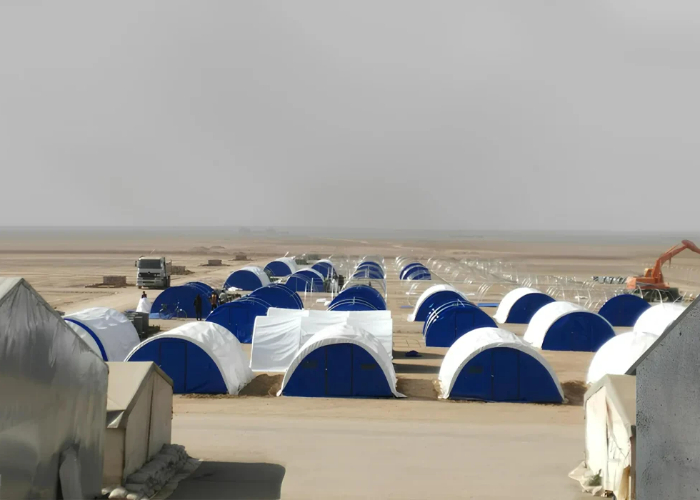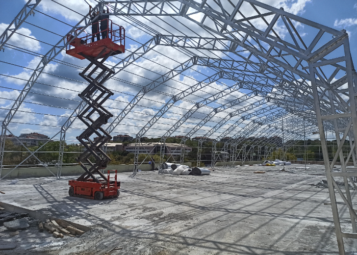 Görseldeki 20 metre makas açıklığına sahip çelik konstrüksiyon çadır iskeleti, zorlu saha şartları için özel olarak projelendirilmiştir. Basit tentelerden farklı olarak; endüstriyel hangar standartlarında statik mukavemete sahiptir. Depo, lojistik merkezi veya atölye olarak kullanabileceğiniz bu yapılar; alev yürümez branda ve yoğun kar yüküne dayanıklı profillerle donatılmıştır. İşinizi ve yatırımınızı güvenceye alan, mühendislik onaylı yapı sistemleri